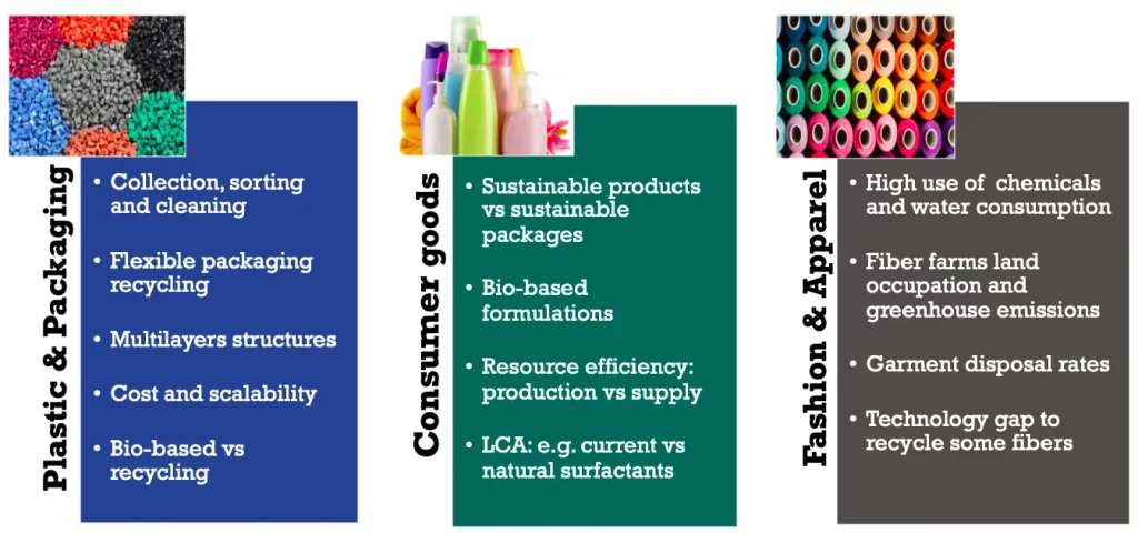 - Consumer Goods: Among the several challenges faced by the consumer goods industry to promote Circular Economy, there is a paradox of offering well-rounded sustainable solutions. It is often seen that some products have a sustainable formulation but in a non-sustainable package and vice-versa. Closing this gap between product and package offering is a huge challenge but also presents companies with a real opportunity to differentiate themselves in the marketplace. Another dilemma is related to balancing out the % of bio-based formulations to ensure that life cycle assessments are efficient, and the truly sustainable options are chosen not only based on the “bio” claim but for their true net environmental impact. This includes also the appraisal of resource efficiency (water, energy, shipping, etc.) during production and supply of packaged goods.