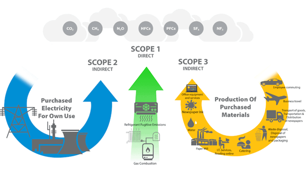 As an effect of digitalization, new technology-enabled emissions introduce additional strains as they are typically categorized as Scope 3 emissions based on the Greenhouse Gas (GHG) Protocol, i.e., those indirectly yielded by an organization throughout the inherent processes within its business, as opposed to emissions from scopes 1 and scope 2, which include those directly produced by energy consumption and own assets, as shown in the above diagram from Green Element [7].