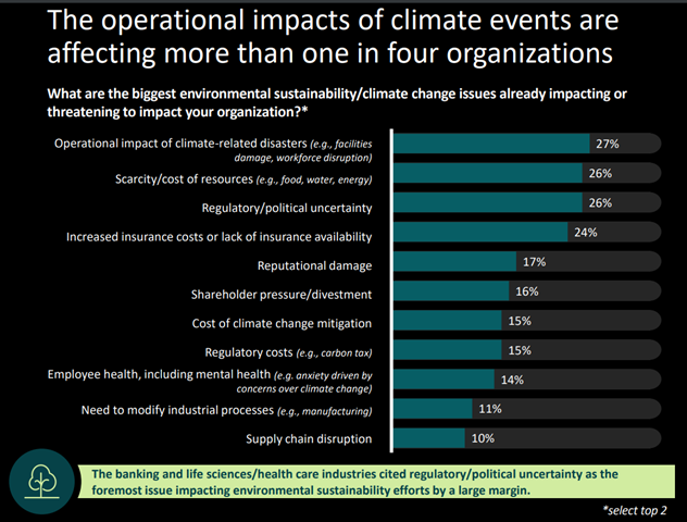 At the top of the list of key environmental challenges that affect businesses today are operational impacts related to climate disasters, cost and scarcity of resources, as well as misaligned regulations and political uncertainties across the globe. The graph from the Deloitte Global Climate survey details this list [2].