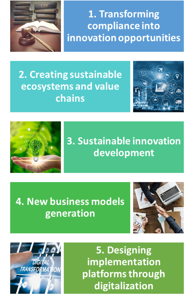 Luckily, on the other hand, many executives are committed to driving sustainability as a business enabler, which allows reaching several social benefits with the development of sustainable innovation for products and/or processes, whilst achieving clear positive financial results [2]. Using sustainability to propel innovation can certainly yield both, bottom- and top-line returns. For example, costs can be minimized by the optimization of resource utilization, process improvements, and new businesses creation. There are 5 typical steps to leverage this momentum and transform current environmental challenges into business opportunities